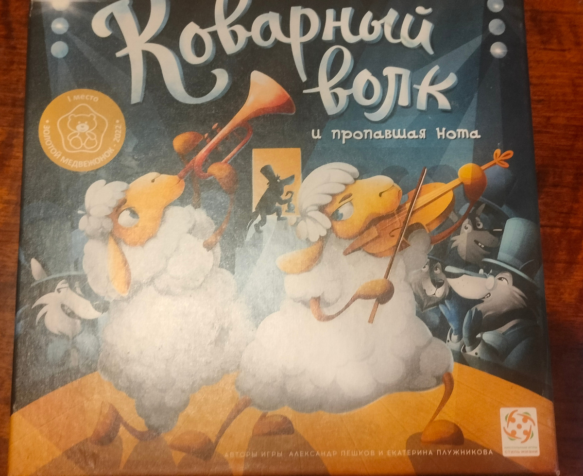 Детектив! Безобразие! Случилось невообразимое!!! Коварный волк украл главный приз музыкального конкурса! Серебряную ноту! Срочно нужна ваша помощь!!! Ну что? Разберемся в этом запутанном деле? Итак перед нами детский очень реиграбельный детектив который научит ваших детей мыслить дедуктивно. Но интересна она будет не только для детей, но и для взрослых. Это одна из очень нами любимых игр. Быстрый сеттинг позволяет сыграть в эту игру перед ужином, или в перерывах между уроками. На коробке у нас заявлено: Подготовка к игре. Кладём поле для побега волка на стол, ставим волка на стартовую клетку. Перемешиваем кодовые карты рубашкой вверх выбираем одну и не глядя вставляем в бубл-переводчик. Перемешиваем планшеты овец, стороной с овощами вверх, делим на 4 стопки по 4 карты. Раскладываем на столе карты волков лицевой стороной вверх. Жетоны овощей складываем в мешочек. Жетоны музыкальных инструментов кладём рядом с полем. Итак, в ходе расследования выяснилось, что на концерте отсутствовал о