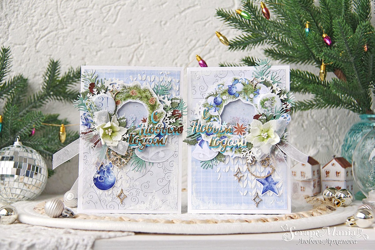 Свои открыточки я делала из коллекции "Волшебный снегопад". На эту коллекцию взглянула немного по-другому. Решила попробовать реализовать давнюю идею, а именно, сделать шейкер из красивого новогоднего елового веночка. В композицию к веночкам добавила сосновых веточек с шишками, бантик из воздушной ленты, чиповые елочные игрушки и чиповые снежинки. И конечно елочные шарики так же украшают композиции на открыточках. В этих открытках я так же спрятала сюрприз в виде небольшой поп-ап конструкции, которая удивит и впечатлит одариваемого.