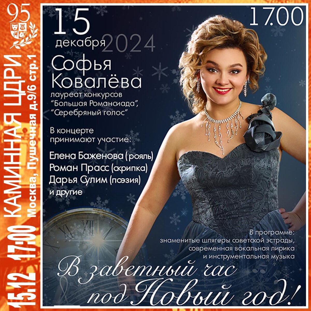 Софья Ковалёва «В заветный час под Новый год» Для Вас прозвучат знаменитые шлягеры советской эстрады, современная вокальная лирика, поэзия и инструментальная музыка. Софья Ковалева — лауреат конкурсов «Большая Романсиада» и «Серебряный голос», обладатель специальной награды «Приз зрительских симпатий» одного из престижных международных конкурсов. Мягкий лирический тембр, сценическое обаяние и артистизм не оставляют равнодушными зрителей. Концертные программы певицы отличаются разнообразием репертуара и сценических образов. «В ЗАВЕТНЫЙ ЧАС ПОД НОВЫЙ ГОД» — новая яркая программа певицы, ее дебют на подмостках легендарного ЦДРИ. Мероприятия пройдет в формате Новогоднего огонька с приветственным бокалом шампанского в компании прекрасных музыкантов Елены Баженовой (рояль)