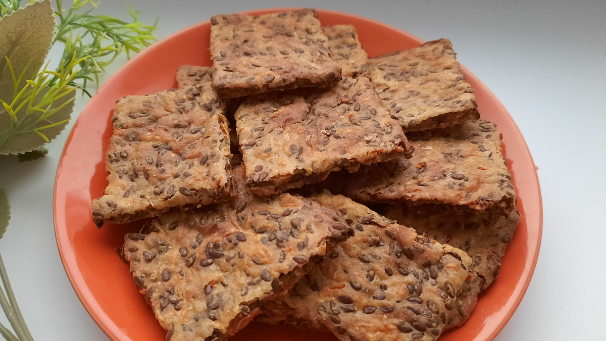 Простой рецепт полезной выпечки. Так и хочется похрустеть! Нам понадобится семена льна- 5 ст.л., морковь- 1 шт., сметаны или йогурт- 3 ст.л., сахар- 4 ст.л., муки- 5 ст.л., яйцо- 1 ст.л. разрыхлитель- 1 ч.л. и 1/2 ч.л. соли. Готовиться очень быстро и получаются вкусными и полезными. Необходимо семена льна замочить в горячей воде на 3 часа, иногда я замачиваю с вечера и получается 6-7 часов.. Морковь измельчить через мелкую терку и соединить все ингредиенты и хорошенько все перемешать. Получается мягкое и вязкое тесто. На противень растилаем пергаментную бумагу и выливаем тесто и равномерно распределяем тесто ложкой смоченной в растительном масле. Толщина теста может быть разной, но примерно 5 мм. или тоньше. Чем тоньше, тем быстрей выпекается. Ставим в духовку 175 градусов на 15-25 минут. в зависимости от толщины теста.. Тесто вырезала на небольшие квадраты после выпечки, но до остывания ( горячими). Получились румяные, хрустящие и полезные. Всем приятного аппетита! Попробуйте,