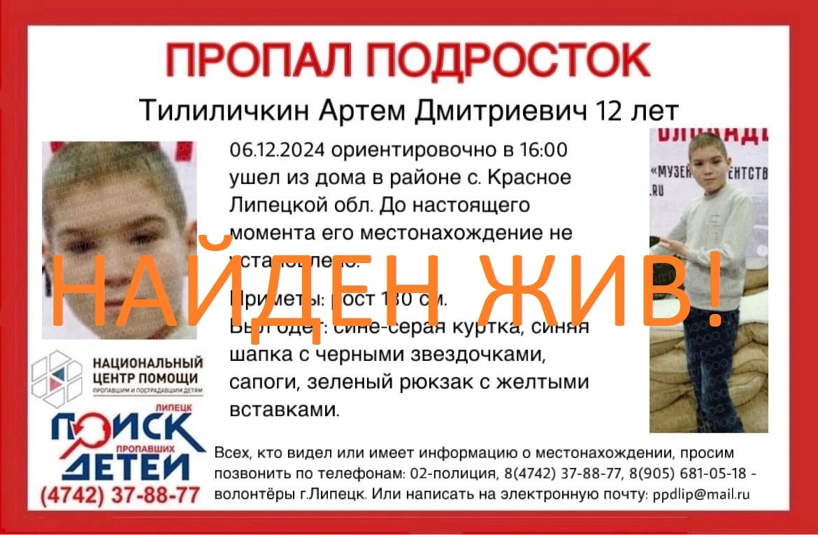 Пропавшего 12-летнего Артема Тилиличкина нашли живым в субботу, 7 декабря, сообщили в ЛООО «Поиск пропавших детей». Ребенок ушел из дома в селе Красное в минувшую пятницу, 6 декабря. С 16:00 о его местонахождении не было ничего известно. Поиски заняли меньше суток. К поиску подключились водители, проезжавшие в направлении Красное — Липецк, которых просили предоставить записи с видеорегистраторов. Также волонтеры проверяли территории посёлков Сухая Лубна, Сахарного завода, Тёплое, Куймань, Новая деревня, Яблоново, Косырёвка, Копцевы Хутора, Кузминские Отвержки. Напоминаем, продолжаются поиски 17-летней Анастасии Терехиной, которая пропала в Грязях 19 ноября.