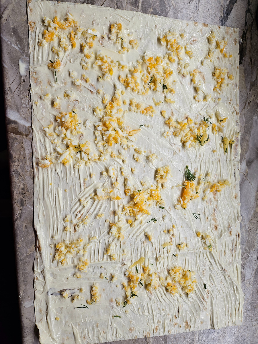 Люблю принимать гостей, но так как работаю и уезжаю из дома в 6 утра, а приезжаю в 19 вечера, то встреча у меня дома в пятницу вечером стала испытанием. Но я справилась, гости остались довольны и сыты благодаря двум закускам и "пятиминутному" муравейнику. Данное блюдо я всегда готовлю, когда нужно что-то быстро приготовить и точно все будут есть. Я как-то делала тарталетки с селёдкой и оказалось, что многие её не едят. Смазать майонезом - это самый простой и быстрый способ. Я беру пачку майонеза "Слобода" на 200мл. У меня он остаётся, но пачки меньшего размера может не хватать. Смазывать надо обильно, так как от этого зависит будет ваш лаваш сухой и рвушийся или нежный и пропитаный. Можно взять не майонез, а сметану, или йогурт. Но такоц лаваш может кислить. Или можно сделать домашний майонез. Яйца после закипания варим 10 минут, а затем измельчаем вилкой до крошки. Распределяем по лавашу. Хорошенько промойте укроп, высушите полотенцем и мелко нарежьте. Распределите по лавашу. Сыр реко