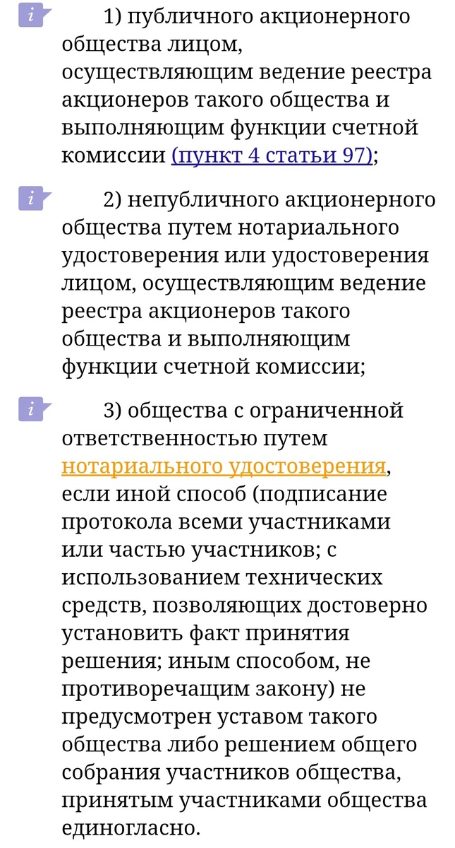 **Как правильно принять альтернативный способ принятия решений для юридического лица** Уважаемые читатели и подписчики канала! Сегодня я расскажу вам о том, как правильно утвердить альтернативный способ принятия решений в обществе. Этот пост будет особенно полезен для организаций, которые являются контрагентами банков. Я работал в трёх крупных банках России и могу подсказать вам универсальные принципы и способы принятия альтернативного способа, которые устроят банк. В части 3 статьи 67.1 ГК РФ перечислены способы удостоверения решений учредителей общества. Принятие общим собранием участников хозяйственного общества решения на заседании и состав участников общества, присутствовавших при его принятии, подтверждаются в отношении: 1. **ПАО** — все решения акционеров регистрируются у лица, ведущего реестр. Здесь без исключений: например, для одобрения крупной сделки или сделки с заинтересованностью вам необходимо обратиться к регистратору. 2. **Непубличное АО** — здесь либо регистратор