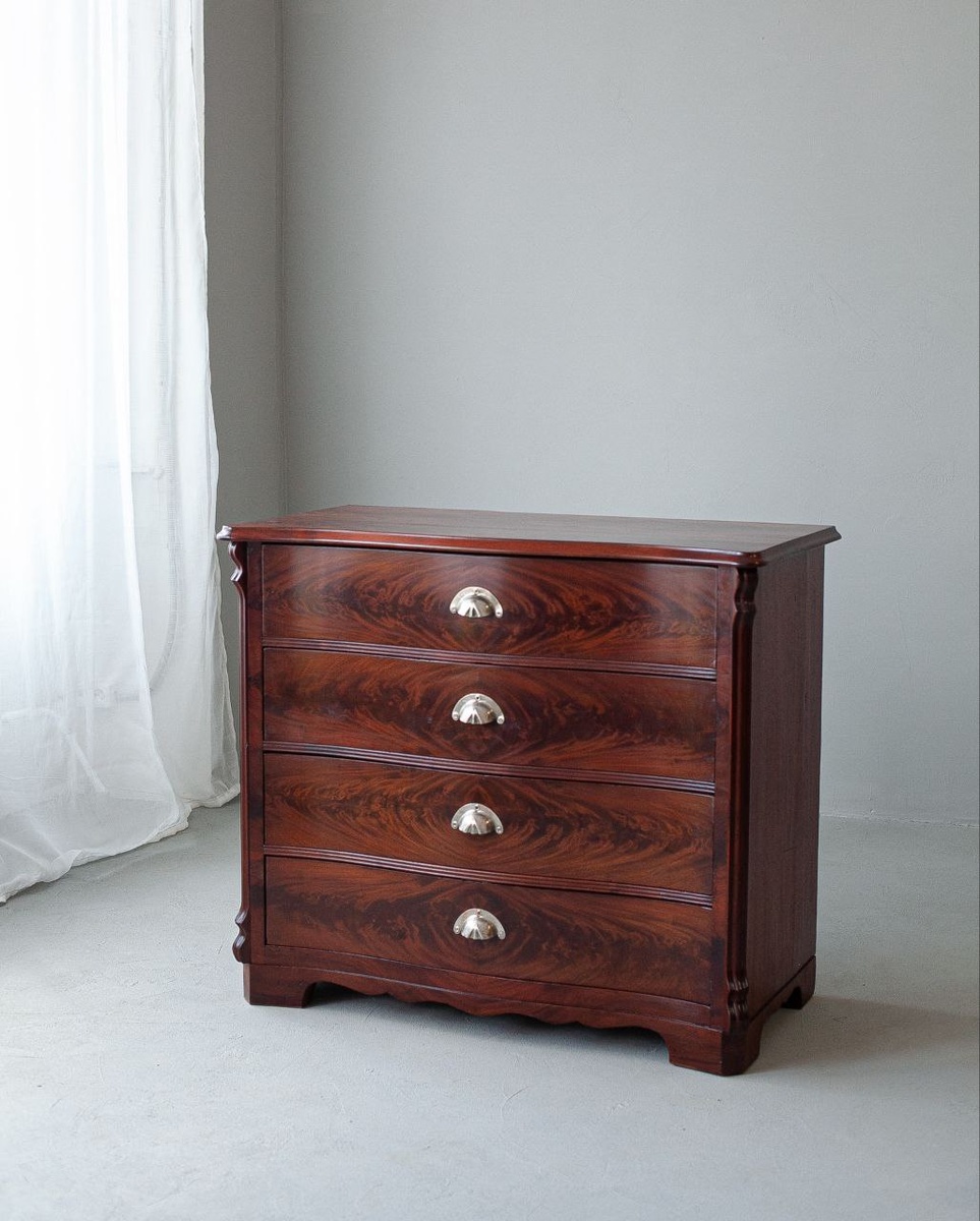 Фото "до" в карусели. Недавно у нас в работе был такой интересный антикварный красавец с невероятно красивым шпоном красного дерева. Такой рисунок называется «пламя» и потрясающе играет на свету. Владелица комода увлекается реставрацией, выкупила комод в Воронеже и хотела обновить его сама, но в итоге решила отдать его на реставрацию нам. У предмета было несколько серьезных травм. Была расколота столешница по верхней части, были и мелкие сколы, отсутствовала ножка. Вчера мы выкладывали видео как раз процесса раскалывания этой столешницы! Мы его разбирали, полностью чистили и шлифовали вручную. Восстановление трещины — отдельный довольно сложный столярный процесс. Ее нужно было расколоть до конца, выровнять, подогнать, склеить, сделать вставки и поколдовать над шпоном, чтобы не было видно стыка. Часть рисунка наносили вручную. Предмет очень эффектный! Рисунок шпона подобран так, что ручки по центру только усиливают впечатление. Кстати, ручки тоже интересные, винтажные, но не оригиналь