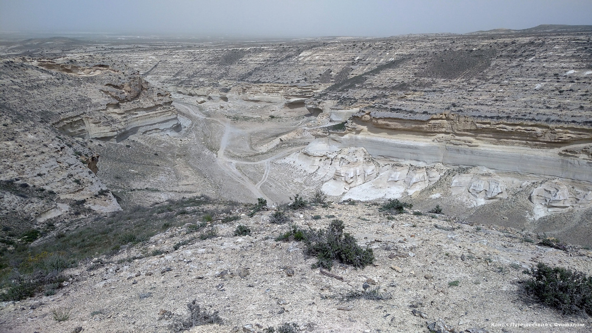 Свернув с асфальтовой дороги на Таучик, мы направились по выжженной солнцем степи полуострова Тюб-Караган в сторону залива Сары-Таш. Накатанные белые паутинки грунтовок разбегались и сходились на краю колоссального мелового оврага, прорезанного стремительными потоками, когда-то стекавшими с горы Унгаза.