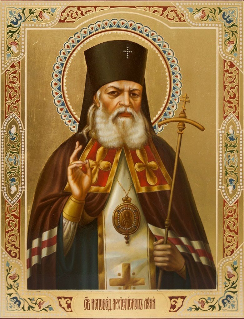 О, святи́телю Луко́, испове́дниче и уго́дниче Христо́в! Услы́ши нас, гре́шных, со умиле́нием припа́дающих к ра́це честны́х и многоцеле́бных моще́й твои́х, и принеси́ моли́тву на́шу к Ми́лостивому Человеколю́бцу Бо́гу, Ему́же ты ны́не со все́ми святы́ми предстои́ши. Испроси́ у Христа́ Бо́га на́шего, коему́ждо дар благопотре́бен и вся, я́же ко спасе́нию поле́зная, да утверди́т ны в ве́ре Правосла́вней и благоче́стии, я́ко изба́вльшеся от ко́зней лука́ваго, избе́гнем вся́кия вражды́, нестрое́ний, ересе́й и раско́лов.