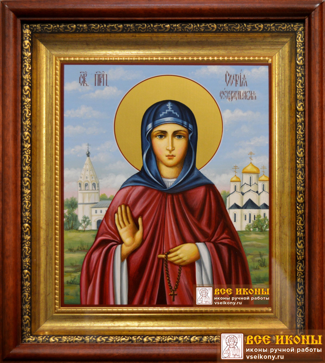 В миру преподобную Софию звали Соломония Сабурова, она была первой женой Московского князя Василия Иоанновича. Он выбрал её из пятисот самых красивых девиц. Брак оказался бездетным и через 20 лет супружества великий князь решил вступить в повторный брак с Еленой Глинской. Это решение осудил Митрополит Варлаам, за что был сведен с престола и заточен в монастырь. Так же за княгиню заступился преподобный Максим Грек - и его заключили в темницу. Все патриархи осудили поступок князя, а Иерусалимский патриарх Марк даже предсказал, что от второго брака родится младенец, который поразит мир своей жестокостью. Родился у Василия Иоанновича и Елены Глинской будущий царь Иоанн Грозный. Великую княгиню Соломонию насильно постригли в монахини с именем София в Московском Рождественском монастыре. После пострига её сразу отправили в Суздальский Покровский монастырь. София покорилась воле Божией и, несмотря на свою скорбь, приняла её. Она находила утешение в усердной молитве. Всей душой она возжелала
