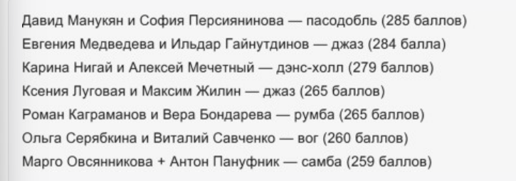 Приветствую всех, мои дорогие подписчики и гости канала "Марина смотрит телевизор". Как вы относитесь к новому танцевальному проекту на телеканале ТНТ "Звездные танцы". Звездные пары составленные из профессионального хореографа и не танцующего звездного участника... очень интересный формат. На данный момент на проекте осталось всего шесть пар. Причем большой перевес команд Утяшевой. Итак, от Ляйсан Утяшевой представлено на данный момент 4 команды - Женя Медведева и Ильдар Гайнутдинов, Виталий Савченко и Ольга Серябкина, Алексей Мечетный и Карина Нигай, София Персиянинова и Давид Манукян. От Татьяны Денисовой представлено всего 2 команды - Ксения Луговая и Максим Жилин, Вера Бондарева и Роман Каграманов. В пятом выпуске проекта "Звездные танцы" гостями стали Егор Дружинин и Оксана Самойлова. Так выглядит таблица результатов пятого выпуска. Лидерами стали Давид Манукян и София Персиянинова. Худшими - Марго Овсянникова и Антон Пануфник - именно они покинули проект "Звездные танцы" в 5 вы