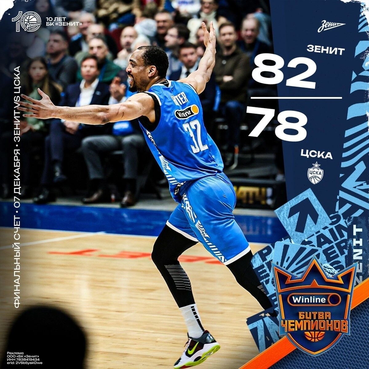 Баскетбольный клуб «Зенит» из Петербурга сегодня в матче чемпионата Единой лиги ВТБ победил ЦСКА. Встреча, которая прошла в Северной столице, закончилась со счётом 82:78 (21:21, 25:18, 18:24, 18:15). Лучшим у зенитовцев стал Дуэйн Бейкон – 20 очков, 5 подборов, 4 результативные передачи. Таким образом, после этой победы «Зенит» и ЦСКА набрали по 15 побед и делят первую строчку в турнирной таблице чемпионата. Следующий матч подопечные Чави Паскуаля проведут дома 11 декабря. Их соперником станет БК «Астана». Напомним, что сегодня футбольный «Зенит» в матче 18-го тура чемпионата РПЛ принимает «Акрон». Начало игры – в 16:30.