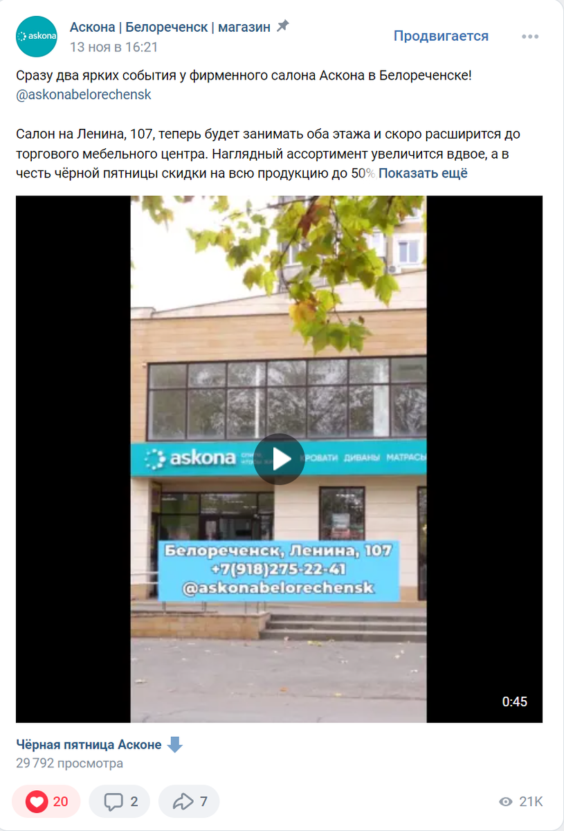 Заказать рекламу 8(989)232-96-93 (WhatsAPP, Telegram) Бюджет: 15 000 р. на 2 соц сети. Цель: повысить узнаваемость и количество реальных покупателей салона "Askona" в Белореченске. Площадки: таргетированная реклама Вконтакте, таргетированная реклама Одноклассники. Срок проведения: 13.11.24-6.12.24. Реклама получилась меньше месяца, потому что относилась к конкретной акции "Чёрная пятница". Плюс ещё были задержки со стороны салона из-за неопределённости со 2 этажом, который в этот же момент сняли и начали обустраивать. В итоге решили, делать эту рекламу без 2 этажа. Сняли рекламный ролик с видеографом за отдельную стоимость, подготовили фото и соц сети. Кстати, у соц. сетей клиента была каша из разных страниц, половина из которых брошенные. Выявили или создали рабочие страницы, вернули доступ и перевели всех под единый логин @askonabelorechensk Группа Вконтакте над ней немного поработал, улучшил вид. Долго ждал выдачу доступа администратора туда. И так совпало, что после появления дост