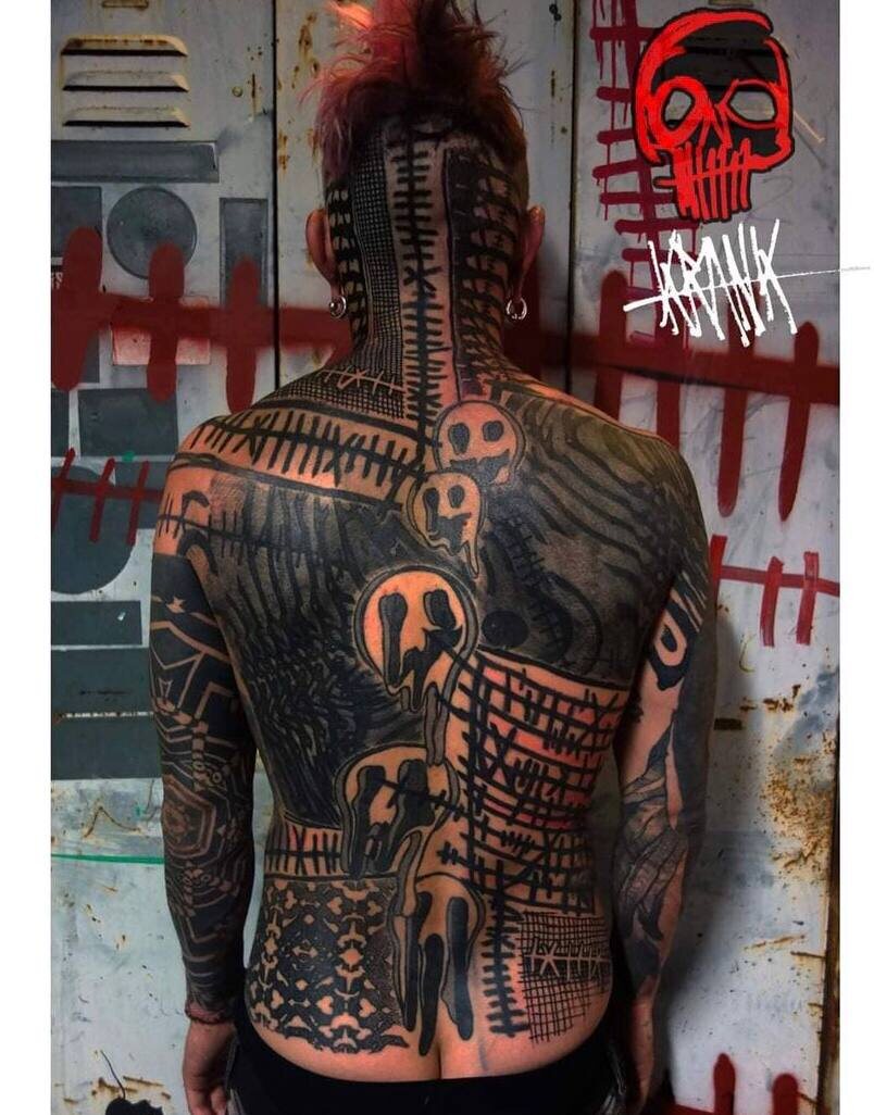 Думаю, все же представляют, что такое пост апокалипсис? Безумный Макс, одежда из мусора, оружие и сумасшедшие тачки. А как бы выглядела татуировка там? Многие, в том числе и я, пытались рисовать дизайны в стиле «пост апокалипсис», но чаще всего выходил обычный неотрадик с использованием этого сеттинга. И будем честны, если бы люди реально делали там тату, то вряд ли бы они были похожи на неотрадик😄 Но есть ребята, которые валят просто квинтэссенцию пост апокалипсиса. И любой человек с их татуировками будет максимально органично выглядеть во вселенной Безумного Макса. С этим поджанром я познакомился через работы yonah_krank и его сотоварищей. Ёнах выходец и среды теКнопанков и сквотеров, и эта среда, как он сам и признаётся, во многом сформировала его стиль. Параллели напрашиваются сами, грязь и хаос с принтов панк/краст мерча, паттерны с протекторов шин, наслоения с затеганных вусмерть стен сквотов, в общем наглядная иллюстрация того, что человек делает то, чем живет. Студия у нег