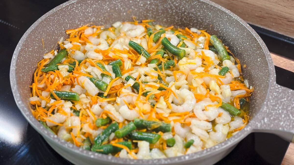 Никогда не готовьте удон с креветками! Потому что если вы его попробуете один раз, то уже не сможете вернуться к удону с цыплёнком и курицей. К тому же, на мой взгляд, это самое удачное азиатское блюдо! В меру острое, сытное и очень аппетитное. Его можно использовать в качестве гарнира для праздничного стола или готовить каждый день. Это блюдо я готовлю достаточно часто, ведь оно занимает совсем немного времени. Поэтому, не сомневайтесь, оно получится у каждого! В оригинале основа включает в себя болгарский перец, но мне больше по вкусу стручковая фасоль, рекомендую попробовать и так, и так, а лучше все вместе. От разнообразия овощей удон станет только вкуснее, но экспериментировать нужно аккуратно. Например, идеально подойдет кабачок. Если вы решите его добавить, то учтите, что кубики нужно тушить на 5 минут дольше. Ингредиенты Приготовление Тщательно промойте морковь, очистите её и нарежьте соломкой. Очистите и промойте лук, затем нарежьте его мелкими кубиками. В сковороде с р