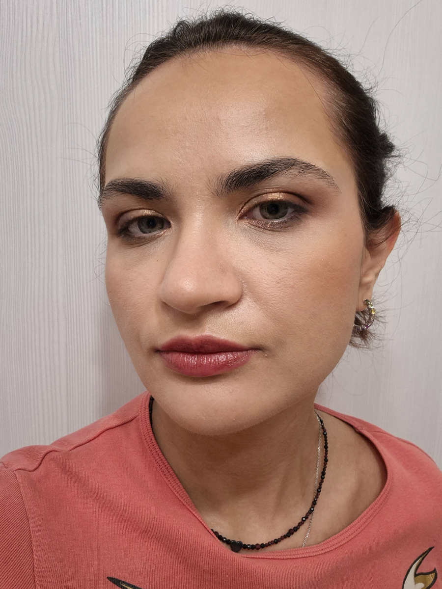 Макияж сегодня сделала продуктами из видео о покупках: 1. Корректор Organic kitchen Звёздатый взгляд 2. Тональный крем Eveline Better than perfect тон 03 light beige warm 3. Румяна Vivienne Sabo Arcane du destin тон 01 4. Бронзер Naj Oleari fancy sun bronzer оттенок 02 biscotto 5. Хайлайтер Shanghai song оттенок 001 string of fate 6. Бальзам для губ Luxvisage Mint balm тон 106 Свотчи слева направо: румяна, бронзер, хайлайтер, бальзам для губ 7. Тени в стике Vivienne Sabo Arcane du destin тон 02 8. Палетка теней BME JustWannaBeYours номер 334 IfNotNow...When? 9. Пудра матирующая запечённая ART-VISAGE velvet mineral тон 2 10. Тушь Vivienne Sabo Cabaret latex Отзыв по продуктам: Тон и корректор у меня в постоянной косметичке, пользуюсь ежедневно. На моей жирной коже тон держится 3-4 часа, потом аккуратно исчезает. Пудра мою кожу матирует на пару часов максимум, но неплохо блюрит. Румяна понравились: стойкие, лёгкие в работе. Бронзер видно на мне не очень хорошо, надо наслаивать.