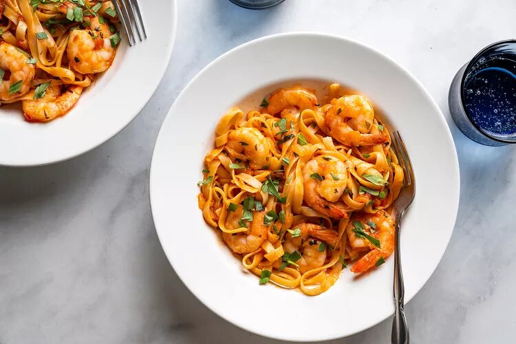 Креветки Фра Диаволо — это классическое острое итальянское блюдо, которое идеально подходит для ужина в будний день, но достаточно изысканно для компании. Это блюдо из макарон также достаточно легкое, чтобы наслаждаться им на свежем воздухе летом. Острый вкус обеспечивается хлопьями красного перца, и вы можете использовать их как можно больше или меньше, чтобы соответствовать предпочтениям вашей семьи или гостей. В рецепте также используются вареные креветки, что делает это блюдо еще более быстрым в приготовлении. Лук обжаривается с хлопьями красного перца, затем добавляется чеснок и готовится до появления аромата; вливается белое вино и уменьшается его количество, затем добавляются нарезанные кубиками помидоры, свежие орегано, эстрагон и базилик, и смесь тушится; в конце приготовления добавляются вареные креветки и немного воды для варки макарон, чтобы немного загустить соус, а затем он выкладывается на макароны, например, феттучини. Подавайте с зеленым салатом, хлебом с корочкой и, в