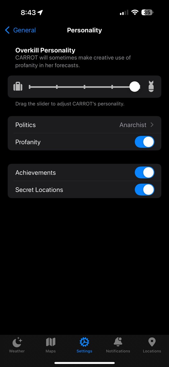 Если вам нужны только факты, вы можете установить личность на Профессиональная или Дружественная. Но настоящее веселье начинается, когда вы меняете слайдер на Саркастичную, Убийственную или Чрезмерную личность. С Чрезмерной, вы можете позволить Carrot добавлять ненормативную лексику в прогнозы. Трудно не улыбнуться, когда ваш прогноз погоды говорит: "Надеюсь, вас проткнет летящий мусор." в ветреный день!