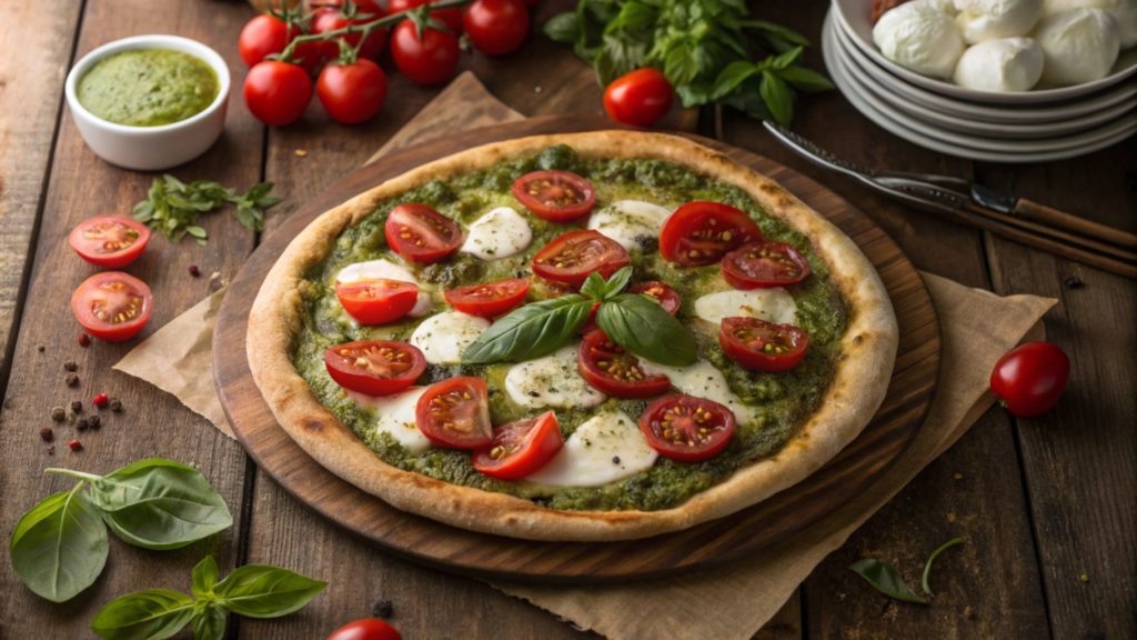 Пицца с соусом песто, помидорами и моцареллой — это изысканное блюдо, которое сочетает в себе свежесть томатов, ароматный соус песто и нежный сыр моцарелла. Это популярное итальянское лакомство не только радует глаз, но и порадует ваше вкусовое восприятие. Легкость и простота в приготовлении делают эту пиццу отличным выбором для семейного ужина или дружеской вечеринки. 1. Разогрейте духовку до 220°C.