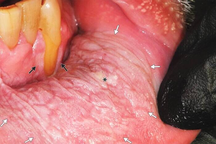 55-Летний мужчина с 40-летним стажем употребления бездымного табака был направлен в клинику стоматологии для обследования по поводу белого пятна на внутренней стороне левой губы. Пятно было бессимптомным и в течение многих лет оставалось на том месте, куда он клал табак. При физикальном осмотре на внутренней стороне левой губы был обнаружен бархатистый, покрытый трещинами участок слизистой оболочки с небольшой язвочкой в центре (звездочка). При растяжении этот участок слизистой оболочки губ образует мешочек (обозначен белыми стрелками). Также были отмечены коричневое обесцвечивание зубов и рецессия десен, граничащая с лейкоплакией (черные стрелки). Был поставлен диагноз "кератоз от употребления бездымного табака", также известный как кератоз от жевательного табака. Кератоз от употребления бездымного табака возникает, когда в месте контакта с табаком образуется утолщенный слой кератина. Это новообразование может быть связано с повышенным риском развития рака полости рта, поэтому необхо