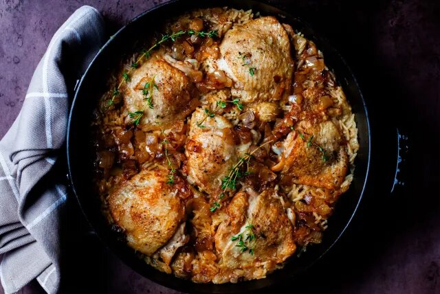 ИНГРЕДИЕНТЫ: 1. 4-6 штук куриных бедрышек 2. Соль и черный перец( по вкусу) 3. 1 столовая ложка подсолнечное масла 4. 1 столовая ложка сливочного масла 5. 3 больших луковице 6. 1/2 стакана риса ПОШАГОВЫЙ РЕЦЕПТ: 1. Выложите курицу кожей вверх на тарелку и щедро посыпьте сверху солью и черным перцем. Через минуту займемся нижней частью. 2. На раскаленную сковороду , добавьте 1 столовую ложку подсолнечного масла и 1 столовую ложку сливочного масла . Выложите курицу кожей вниз и готовьте до тех пор, пока нижняя часть не под золотится , около 4–5 минут. Пока она подрумянивается, приправьте сверху, дополнительно солью и перцем. После того, как подрумянится, переверните кусочки и подрумяньте вторую сторону, еще около 3–4 минут. Переложите курицу на тарелку. 3. Добавьте 2 столовые ложки сливочного масла в оставшийся жир из под курицы . После того, как масло растопится, добавьте лук и 1 чайную ложку соли. Готовьте лук в течение 15 минут или до тех пор, пока он не станет золотист