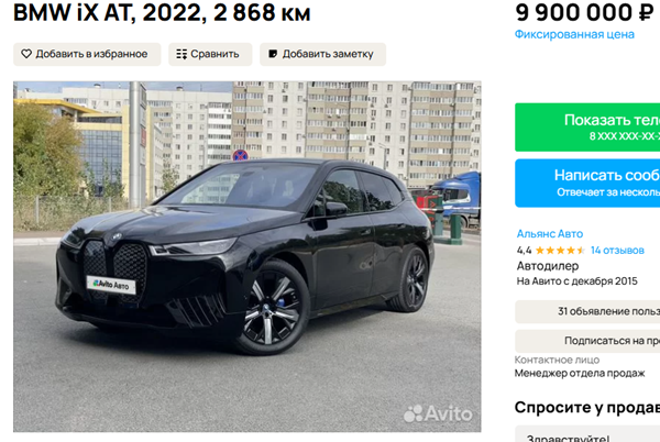 Привет, уважаемая публика! Начался декабрь, и пришло время проанализировать рынок б/у электромобилей от казанских дилеров. Напомню, что я рассматриваю электрички с левым рулём, с пробегом более 500 км. В начале ноября у наших дилеров продавалось 10 таких автомобилей. Посмотрим, что изменилось за прошедший за месяц, и в какую сторону сдвинулись цены. Дилеров перечисляю в алфавитном порядке. В автосалоне "Альянс Авто" на ул. Сибгата Хакима - в продаже единственная электричка с пробегом: Полноприводный кроссовер BMW iX 2022 года выпуска сейчас предлагают за 9,9 млн. рублей - ровно на миллион рублей меньше, чем месяцем ранее. В описании указано, что это комплектация xDrive50 Suite Sport. У неё батарея ёмкостью 111,5 кВтч, суммарная мощность двух электродвигателей - 523 л.с. Заявленный пробег - 2868 км. В автосалоне "АРЕНА АВТО" на ул. Сибгата Хакима остался один электромобиль с пробегом: Белый Zeekr 001 продаётся здесь второй месяц, а цену уже подкорректировали в сторону снижения. Теперь з