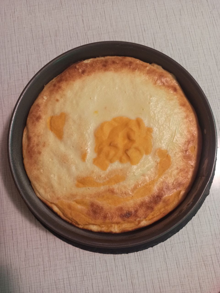 Доброго воскресного утра. Продолжаю сегодня тыквенную тему. Вашему вниманию – запеканка с творогом и тыквой. Необычная, яркая и ароматная. С таким блюдом на завтрак позитивный день и отличное оранжевое настроение гарантировано! Полосатая запеканка с тыквой. Творожный слой Мягкий творог – 500 грамм. Сахарный песок – 50 грамм. Яйца – 2 штуки Крахмал (лучше-кукурузный) – 1 столовая ложка Тыквенный слой Пюре тыквы – 500 грамм Яйца – 2 штуки Сахар – 50 грамм Крахмал (лучше- кукурузный) - 1,5 столовой ложки Тыкву предварительно запечь в духовке. Способ приготовления. Ингредиенты тыквенного слоя смешать погружным блендером. Творожный слой перемешиваем венчиком или силиконовой лопаткой. Оба слоя должны быть одинаковой консистенции. Если творожный слой получился слишком плотным, можно добавлять в него понемногу молока или сливок, продолжая перемешивать. Массу выкладываем в круглую форму (у меня – 22 см.) попеременно по 4 столовые ложки, начиная с творожного. Форму предварительно смазываем масло