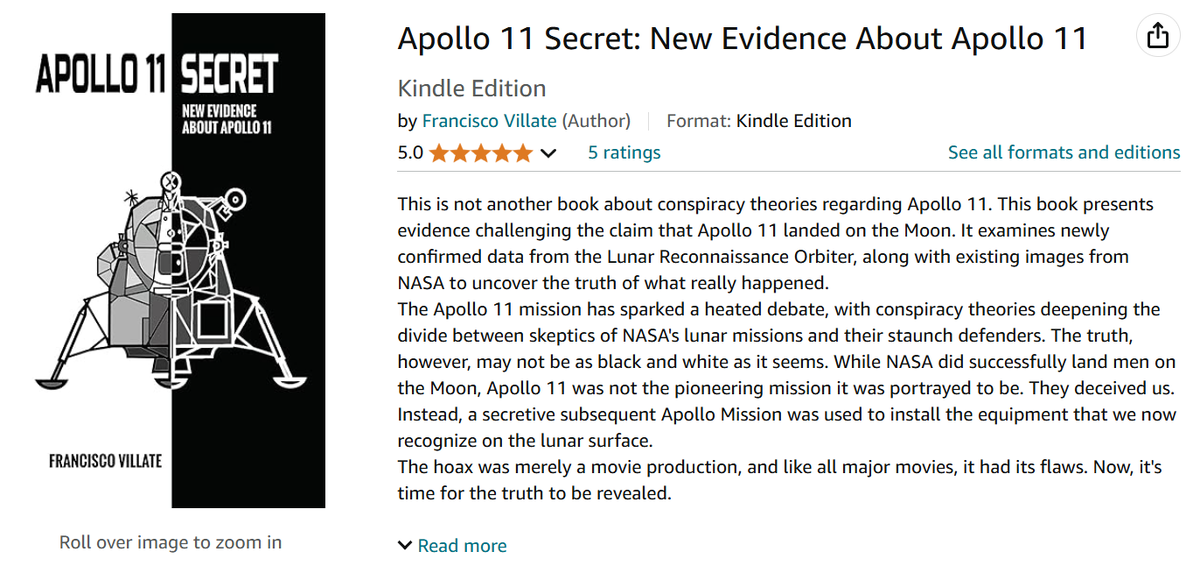 Написал нам Франсиско Вильяте, автор книги, продающейся на Amazon. Писатель, искатель НЛО и инженер, который, по его словам, имеет опыт фотограмметрии. Да, иногда конспирологи пишут нам лично. Оказалось, что Франсиско — не вполне даже конспиролог. Его идея выглядит несколько странно и оригинально: дескать, поддельной была только миссия «Аполлона-11», а все остальные были настоящими. ¡Caray!