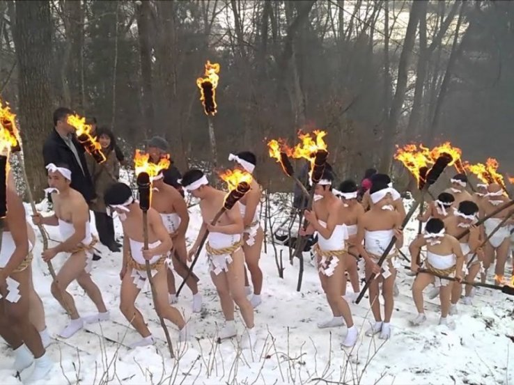 Отправляйтесь на гору Косио в Иватэ, чтобы принять участие в приготовлении моти и получить благословение местного синтоистского священника. Затем приготовьтесь наблюдать за тем, как полуголые мужчины идут по снегу и ледяному ветру. Поднимаясь на гору с зажжённым факелом в руке, они решительно держат во рту бумажное благословение. В конце восхождения мужчины дерутся — иногда в буквальном смысле — за мешочек с талисманом. Говорят, что тот, кто получит мешочек, будет жить в достатке весь год.