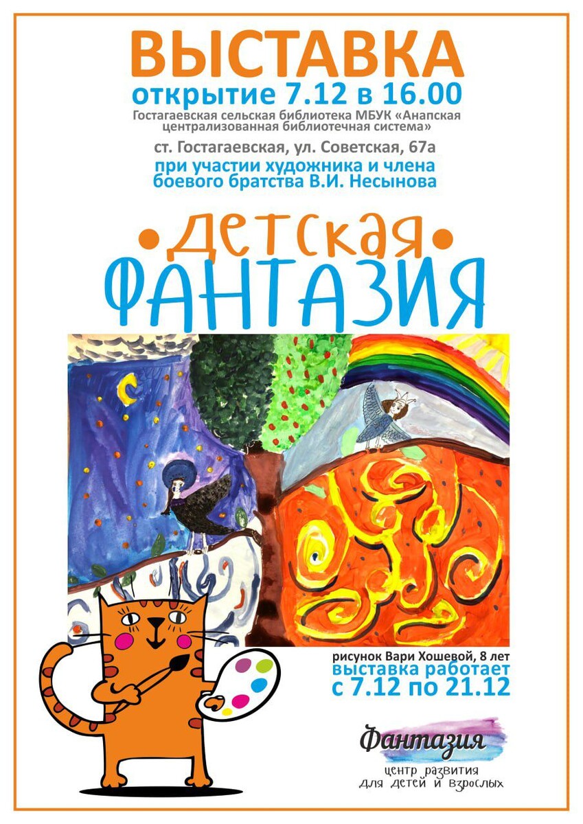 Центр развития для детей и взрослых "Фантазия" открыл выставку в библиотеке станицы Гостагаевской 7 декабря 2024 года. Инициатором этого мероприятия стала восьмилетняя девочка Варя Хошева. Когда выставку объявили открытой, у неё потекли слёзы радости от исполнения мечты. Если когда-нибудь в станице Гостагаевской будет настоящий выставочный зал для художников , то его обязательно нужно назвать именем Вари Хошевой - великолепной мечтательницы и фантазёрки! А пока библиотека всё сделала ( отличный ремонт), чтобы дать рисующим детям встретиться с профессионалами, членами Боевого Братства г. Анапы (лучшим в Южном Федеральном Округе) писателем и краеведом Валерием Валиевым и художником , чьи произведения в постоянных экспозициях художественных музеев Мира, Владиславом Несыновым. Участники выставки "Детская фантазия": Ева Ситникова 11 лет.