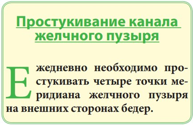 Простукивание канала желчного пузыря и массаж канала перикарда займёт в общей сложности 20 минут в день – по 10 минут на каждый канал. Изменение привычек сна, отказ от раздражительности, внимание к чистоте ЖКТ – это изменение поведения, привычек.