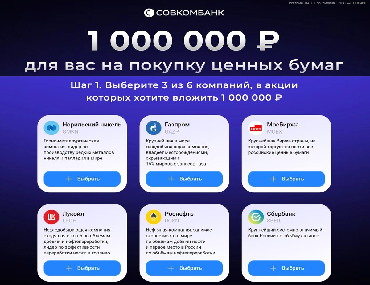 Совкомбанк запускает акцию, предлагая 1 000 000 рублей на приобретение акций.