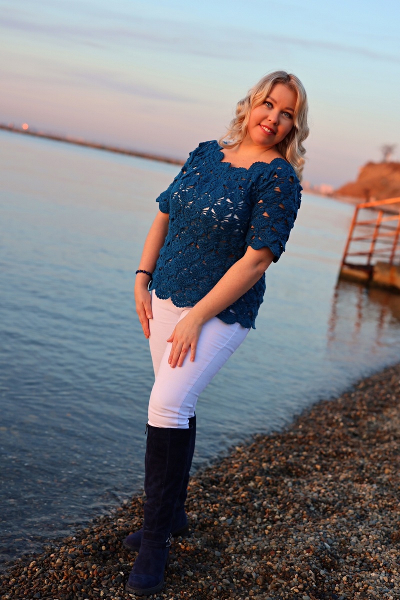 Вязаный джемпер с коротким рукавом узором "Веера" из шикарной супер мягкой 100% турецкой мериносовой шерсти, пряжа Dona Fibra Natura👍💙