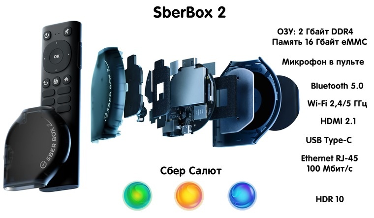 Первая версия считается уже устаревшей, так что смотреть стоит только в сторону SberBox 2. Медиацентр получил современные Type-C, липучку на корпусе для удобного крепления, а также LAN-порт для обеспечения максимальной стабильности соединения. Плюс пользователям доступны поддержка HDR10 и установка сторонних APK приложений.