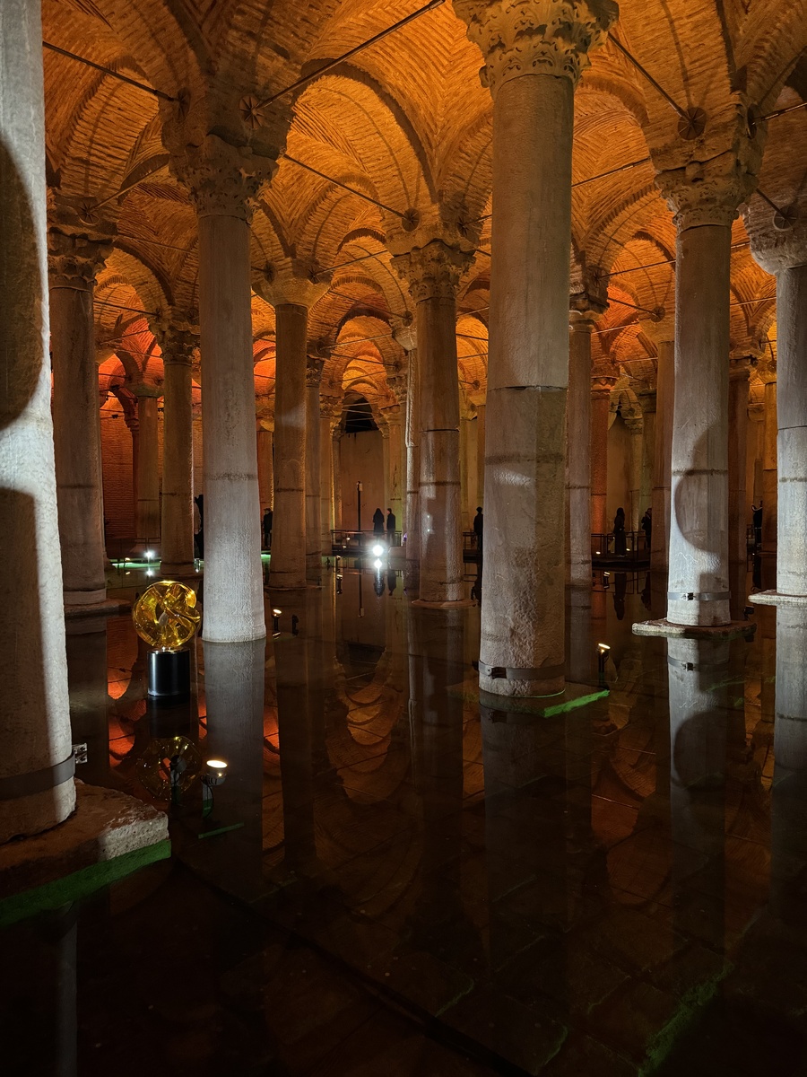 Когда-то Турция была Грецией, а Стамбул был Константинополем, а никого из нас ещё не было на линиях этой судьбы. От греков остались акведуки и цистерны – грандиозные подземные хранилища воды. Так как своих рек в этом месте не было и нет, то вода раньше по акведукам, сегодня по трубам поступает в город. Вода и сегодня не для питья, стоит брать обычную бутилированную для питья и утренней гигиены. И красивая горгона здесь живёт, специально подождали нужной подсветки для её тени. Успели осмотреть две цистерны. Филоксену и Базилику. В Филоксене какой-то странный запах преобладает, странно высокая цена при входе, да ещё наличными нельзя оплатить билет. Можно дорожной картой Стамбула. Но место с плохой что ли энергетикой, мне показалось. Вроде бы там прикапывали труппы от разборок нескольких банд. А вот та, что Базилика, прямо прекрасна и свето-шоу тут постоянно работает, и объекты из разных эпох и фильмов современных. В этом удивительном районе сочетается греческая застройка, турецкий выбор
