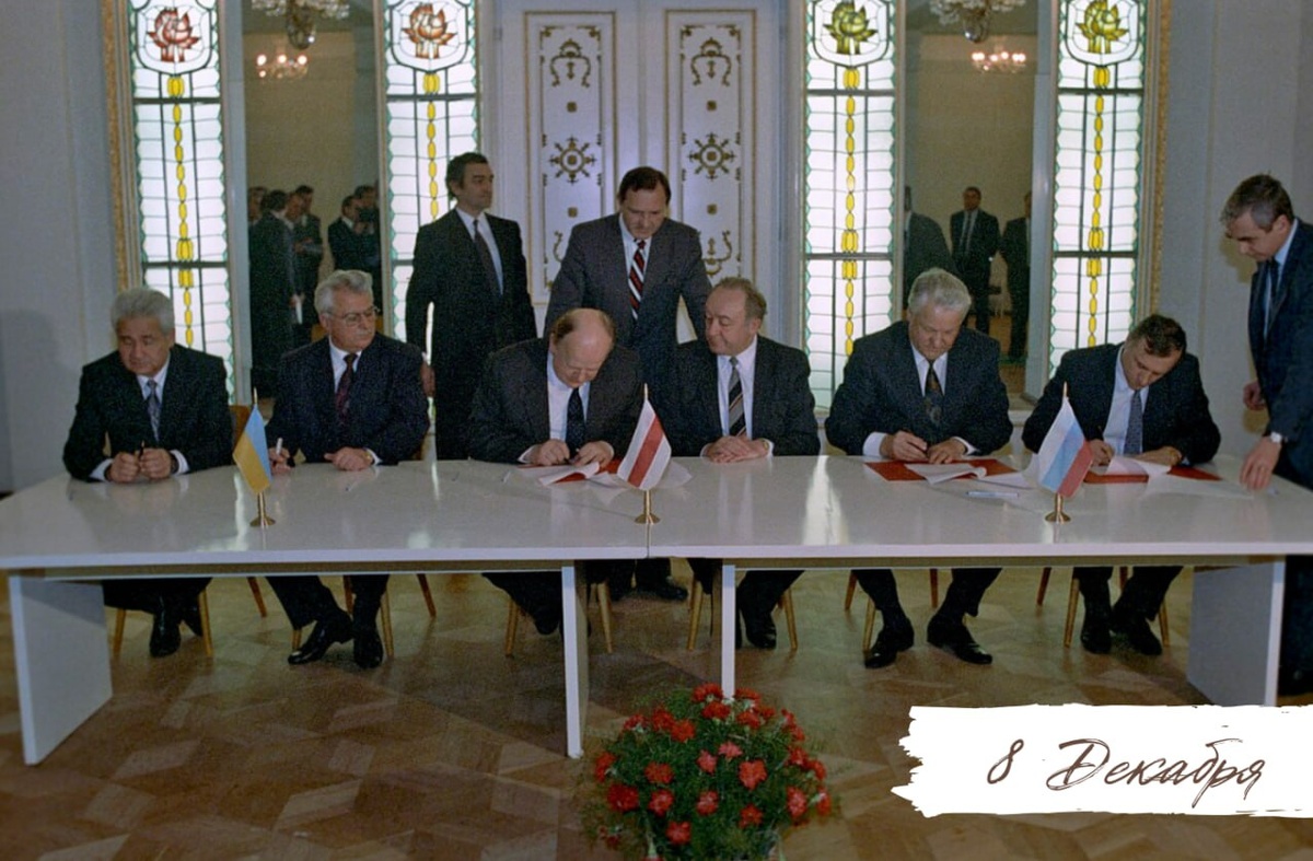 8 декабря 1991 года в Беловежской пуще в резиденции Вискули официальными представителями России, Белоруссии и Украины было подписано "Соглашение о создании Содружества Независимых Государств", согласно которому СССР"как субъект международного права и геополитическая реальность прекращает своё существование". Соглашение подписали: - от РСФСР - Борис Ельцин и Геннадий Бурбулис; - от Республики Беларусь - Станислав Шушкевич и Вячеслав Кебич; - от Украины - Леонид Кравчук и Витольд Фокин. С 1988 года на фоне экономического кризиса в союзных республиках начался "Парад суверенитетов" - начали приниматься декларации о государственном суверенитете. 17 марта 1991 года состоялся Всесоюзный референдум, на который был вынесен вопрос: "Считаете ли Вы необходимым сохранение Союза Советских Социалистических Республик как обновлённой федерации равноправных суверенных республик, в которой будут в полной мере гарантироваться права и свободы человека любой национальности?" В референдуме приняли учас