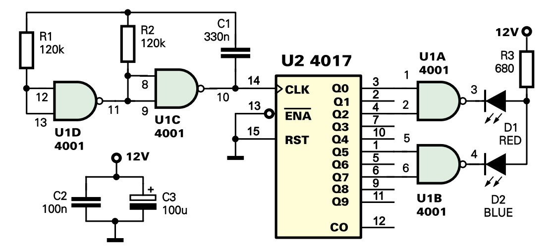 Добрый день дорогие друзья. Настала зима, и радиолюбителей появилось больше свободного времени, и в выходной день иногда хочется собрать какую ни будь несложную конструкцию. В моем электроном архиве есть огромное количество простых электронных самоделок, и одну из них, которая очень простая и не требует дефицитных деталей , я сегодня представлю Вашему вниманию. Это полицейская мигалка. Ее можно установить на детских машинках, катерах, роботах и пр. Полицейская мигалка имитирует работу полицейских стробоскопов. Эти лампы мигают поочередно – одна лампа два раза, другая два раза. Принципиальная схема Как видно, «Полицейская мигалка» построена на популярных интегральных схемах (4001 и 4017). На логических элементах U1C и U1D реализован нестабильный генератор. Генерируемый им сигнал управляет работой счетчика U2. Входы элементоа U1A и U1B подключаются к счетчику таким образом, что светодиоды D1 и D2 мигают попеременно два раза. Чтобы наша «мигалка» выглядела как настоящая, один диод долже