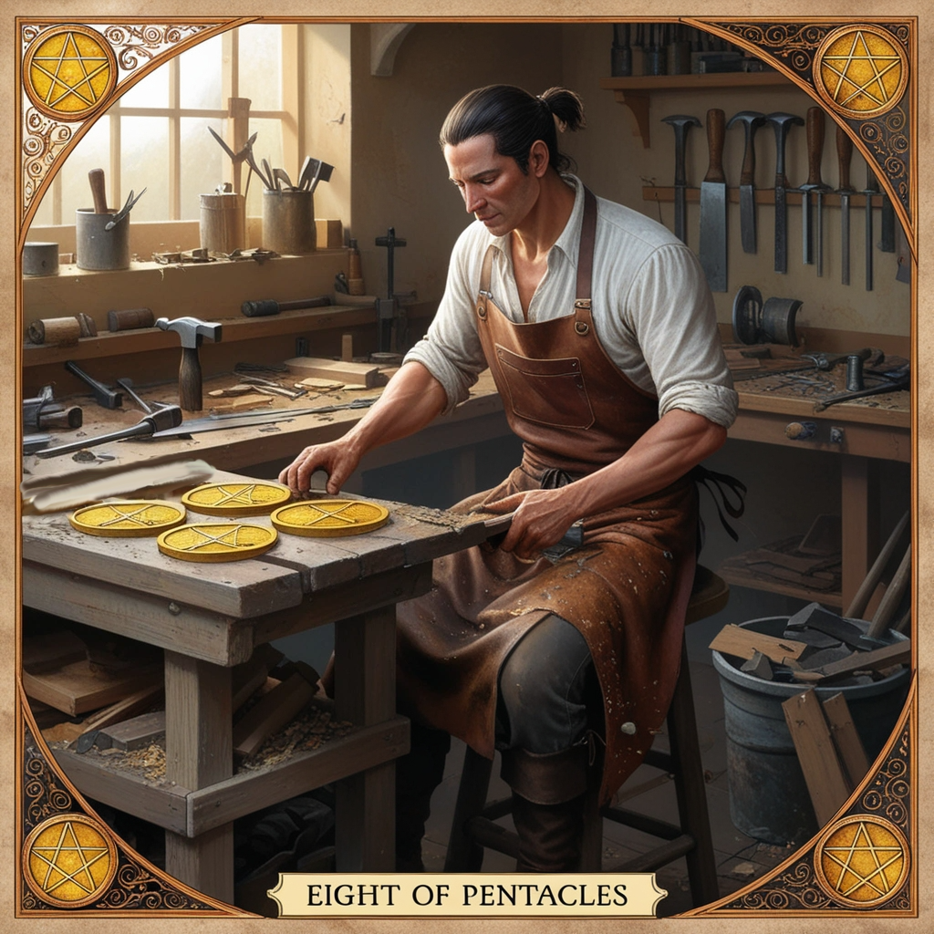 Восьмерка Пентаклей - это карта, которая символизирует решимость, упорные усилия, преданность делу и успех. На этой карте изображен мужчина, который усердно работает. Он занят созданием одного из пентаклей. На карте в ряд выстроилось множество готовых пентаклей. Он достраивает их по одному и не сдастся, пока не закончит все.