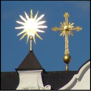 Здесь позволю себе небольшое отступление. Обратите внимание что на фото киевской лавры плоские солярные знаки ориентированны в разные стороны. В случае установки крестов, ориентирован по сторонам света обычно только главный крест на главном куполе, остальные кресты могут быть направлены как угодно, обычно так чтобы лучше были видны с улицы ведущей к храму или по оси (фронту) фасада здания. Хотя эта мода относительно молодая. Еще в 19 веке никакой привязки к северу у косой палочки на "православном" кресте не было. И даже сейчас осталось не мало церквей у которых косая палочка смотрит куда угодно, но только не на север. На запад, на восток и в некоторых случаях вообще на юг. Например на юго-запад ориентирован крест у Саввинской церкви (смотрим на крест и на тени).