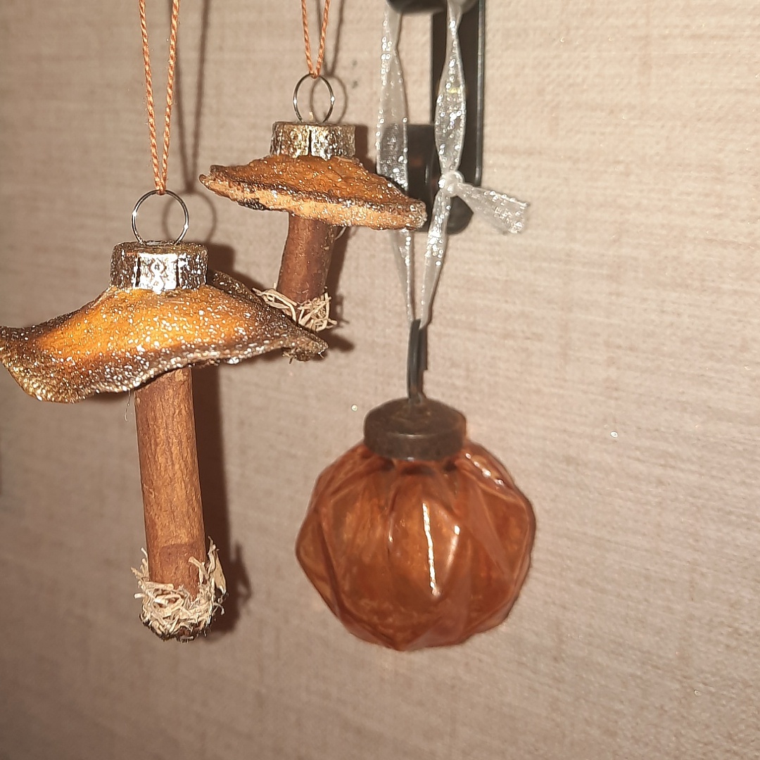 Правда оказалось, что видимо творцы разобрали в магазине всю корицу в палочках, еле нашла. Все оказалось просто. Дырочки под подвес лучше, конечно сделать в еще не окончательно сухом состоянии. Просто иглой. Можно сделать подвес-бусину, просто веревочку. Но у меня были лишние, я и сделала с ними. Вот что в итоге у нас получилось: Сде