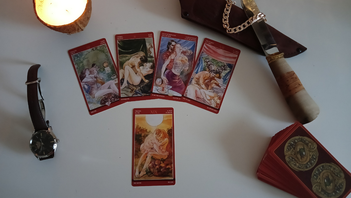 Мои очаровательные подписчицы, подписчики и гости моего канала! Я от всей души пишу вам слова благодарности за просмотры, лайки и комментарии к моим статьям и видео роликам! Эта статься попалась Вам на глаза не случайно. Сосредоточьтесь на теме расклада и откройте свой разум. Почувствуйте сердцем, насколько Вам откликается этот расклад. Старайтесь воспринимать эту информацию легко и с юмором! Искренняя улыбка и позитивный взгляд на мир делают Вашу жизнь ярче! Заглянуть в чужие сны – задача не из легких, но карты Таро, словно ключи от потайных дверей, помогают приоткрыть завесу тайны. Сегодня мы попробуем расшифровать послания из мира грез и ответить на волнующий вопрос: "Что ему снится о тебе по ночам?". Перед нами лежат Десятка кубков, Восьмёрка мечей, Паж пентаклей, Колесница и, в основании расклада, яркое Солнце. Что же расскажет этот расклад? Десятка кубков, карта семейного счастья и гармонии, на первый взгляд рисует идиллическую картину. Ему снятся уютные вечера, полные тепла и р