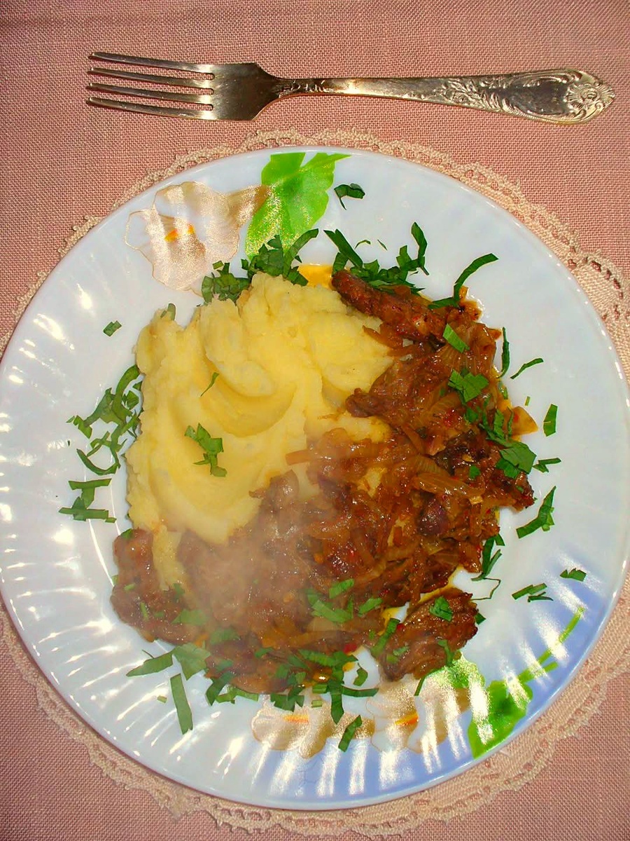 Ой, а что это у вас такое непонятное в тарелке?) А это у нас баранина с луком, в аджичном соусе. Да с картофельным пюре. С пылу, с жару. Вкусно, быстро, остро. Баранину нарезать некрупной соломкой, как на бефстроганов. В сотейнике разогреть немного растительного масла. Обжарить баранину до зарумянивания. Жарить, помешивая, на среднем огне, около 7 минут. Репчатый лук нашинковать полукольцами. Добавить лук к баранине и продолжать обжаривать, около 10 минут. Посолить, слегка поперчить свежемолотым черным перцем. Приправить щепоткой уцхо сунели. Затем добавить свежую аджику, перемешать и готовить еще 7 минут. Подавать с картофельным пюре и зеленью ( укроп, петрушка, зеленый лук нарезать). Баранина - 0.5 кг, Лук репчатый - 2 шт, Масло растительное - столовая ложка, Уцхо - сунели - щепотка, по вкусу, Соль, черный перец - опционально, Домашняя сырая аджика из перцев и чеснока - 2 - 3 ст ложки, по вкусу, Зелень - опционально.