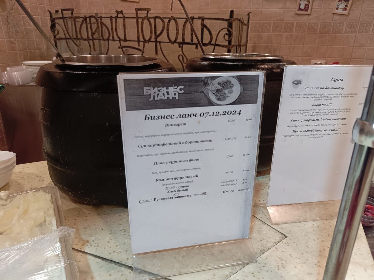 Субботний обед в "Старом Городе" или столовая выходного дня! Всем привет, дорогие друзья, Бывали в ресторанчике "Старый Город" на Грабцевском шоссе? Это небольшое заведение, которое работает по системе столовой с 11.00 до 16.00 в будние дни и с 11.00 до 15.00 в выходные. Сегодня я расскажу вам о том, чем там угощают и сколько это стоит, ы На канале я уже немного рассказывал про этот ресторан. Но в прошлый раз мы пробовали блюда из основного меню А-ля карт, а сегодня будет меню обеденное. Посмотрим, пострадает ли качество или нет. Кстати, про интерьеры я тоже рассказывал в прошлой статье, на сегодняшний день там абсолютно ничего не поменялось. Так что, кому интересно, рекомендую к прочтению: "Старый город" предлагает нам два варианта обеда. Вы можете выбрать бизнес ланч, в который входят строго определённые блюда и заплатить за него 250 рублей. Либо набрать того, чего хотите сами, но тогда стандартный набор в салат/первое/ второе и компот выйдет не меньше 400 рублей. Во всяком случае