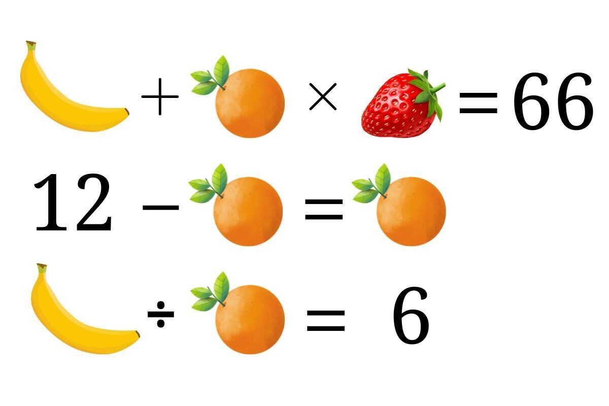 Тренировка мозга важна в любом возрасте, но особенно она важна для детей, молодежи и пожилых людей. Не обязательно решать сложные задачи часами напролет, но регулярность крайне важна. Узнайте, как решить математическую головоломку с фруктами и ягодой. Какую цифру означает банан, апельсин и клубника? Читайте также: Эти уравнения могут решить только самые сообразительные. Какие числа спрятаны под игрушками? На самом деле это уравнение с тремя неизвестными. Мы можем легко вставить «b» вместо банана, «k» вместо клубники или «a» вместо апельсина. В равной степени мы можем заменить эти символы на классические математические x, y, z или a, b, c. Тем не менее стоит знать, как подходить к решению такого рода задач. Головоломка в виде уравнения выглядит так: ... Продолжение читайте тут. (Или тут.) Читайте также: Эту задачу получается решить только у школьников? Проверьте, помните ли вы элементарные правила