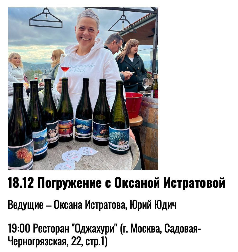 Друзья, 18 декабря в гости к нашему клубу приедет невероятная Оксана Истратова и мы сможем вместе с ней попробовать ее уникальные вина. Оксана Истратова известна как выдающийся инструктор по глубоководному дайвингу и руководитель дайвцентра BLACKSEAEXPLORERS в Севастополе. Вина ее проекта производятся с использованием кахетинской технологии, которая включает винификацию и выдержку в квеври на мезге и гребне.🍇 До 2023 года проект полностью основывался на покупных виноматериалах, однако с 2023 года производство частично ведется из собственного винограда. Несмотря на юный возраст, вина от Oxana Istratova Wine уже получили признание среди ценителей и экспертов. На конкурсе "Винный гид Продэкспо" в 2024 году Muskat Quevri 2020 был удостоен золотой медали🏅, а Saperavi Quevri 2022 – серебряной.🥈 📜В программе: ✔️Дегустация 6 вин от Оксаны с винификацией и выдержкой в квеври на мезге и гребне в среднем 5 месяцев. ✔️Ведущая дегустации - Оксана Истратова, основатель винодельческого проекта Ox