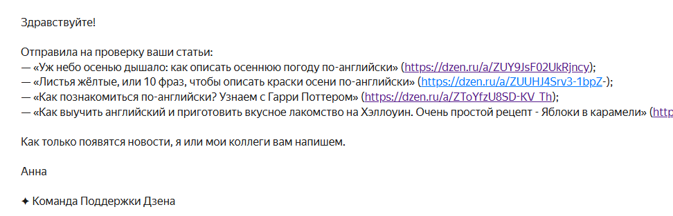 Через час я получила ответ от техподдержки, что статьи отправлены на проверку.