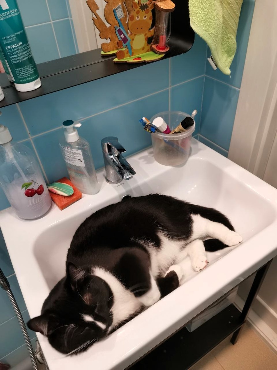 На фото же (кто ещё не знает) наш домашний питомец Барсик. Когда дома жарко, всегда забирается спать в раковину. Летом так вообще исключительно там и спит. Вообще не теплолюбивый парень.