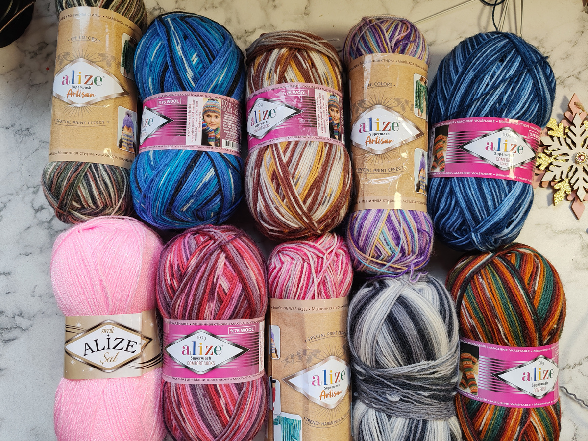 Носки я не очень люблю вязать. Легче ребёнку свитер связать. Но носочную пряжу я закупила и теперь нужно её превратить в носки. Надеюсь я смогу две пары носков осилить в месяц на детей. И смогу к концу 2025 показать 24 пар носков. В виде фотографии. Первые три пары я начала вязать так сказать замахнулась. Первые носочки из бохо Вторые из ализе супервош И трети тоже из ализе супервош комфорт. Желаю себе терпение и довязать задуманное до конца🤗🤗🤗🤗
