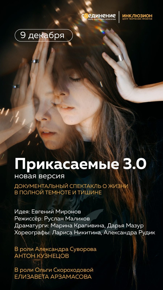 В Новом пространстве Театра Наций 9 декабря в 20:00 состоится показ спектакля «Прикасаемые 3.0». Согласно пресс-службе проекта, в третьей версии постановки примут участие Елизавета Арзамасова и Антон Кузнецов — вместе со слепоглухими героями они расскажут, каково это — жить в полной темноте и тишине. По словам Лизы Арзамасовой, «это невероятное расширение кругозора, совершенно новый взгляд на мир. Кажется, что у нас широкий круг общения и мы так много знаем, но на самом деле существует столько неизвестного, включая другие языки, о которых мы даже не догадывались. Иметь возможность общаться с этими невероятными людьми, узнавать их истории, делиться своими, а затем еще и играть вместе в одном спектакле — это настоящее чудо». Ирина Поволоцкая увлекается живописью, пишет стихи, танцует фламенко и обожает экстремальную езду на мотоцикле. Алексей Горелов — спортсмен-триатлонист и человек, который всегда заряжает окружающих своей улыбкой. Александр Бурмистров любит проводить время со своей се