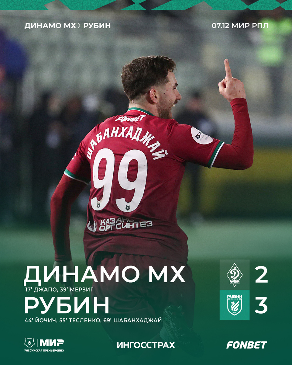 «Рубин» одержал волевую победу в Махачкале над местным «Динамо» в заключительном матче года. Проигрывая по ходу встречи 0:2, наша команда сумела забить трижды и победить. Голами за «Рубин» отметились Богдан Йочич, Егор Тесленко и Дардан Шабанхаджай. МИР – Российская Премьер-Лига. 18 тур. Динамо (Махачкала) – Рубин – 2:3 (2:1). 7 декабря 2024. «Анжи Арена». 4 130 зрителей. Судья – Алексей Сухой (Люберцы). Голы: Джапо, 17; Мрезиг, 39 – Йочич, 43; Тесленко, 56; Шабанхаджай, 69. Рубин: Ставер (в), Грицаенко, Безруков, Рожков (Нижегородов, 78), Тесленко, Вуячич, Угочукву, Чумич (Чуни, 46), Йочич (Ходжа, 88), Даку, Шабанхаджай (Иванов, 88). Динамо: Волк (в), Алибеков, Шумахов, Пальцев, Джапо (Сундуков, 73), Кагермазов (Хоссейннеджад, 82), Глушков (Юсупов, 82), Мрезиг, Сердеров (Гаджиев, 62), Агаларов (Магомедов, 73), Касинтура.