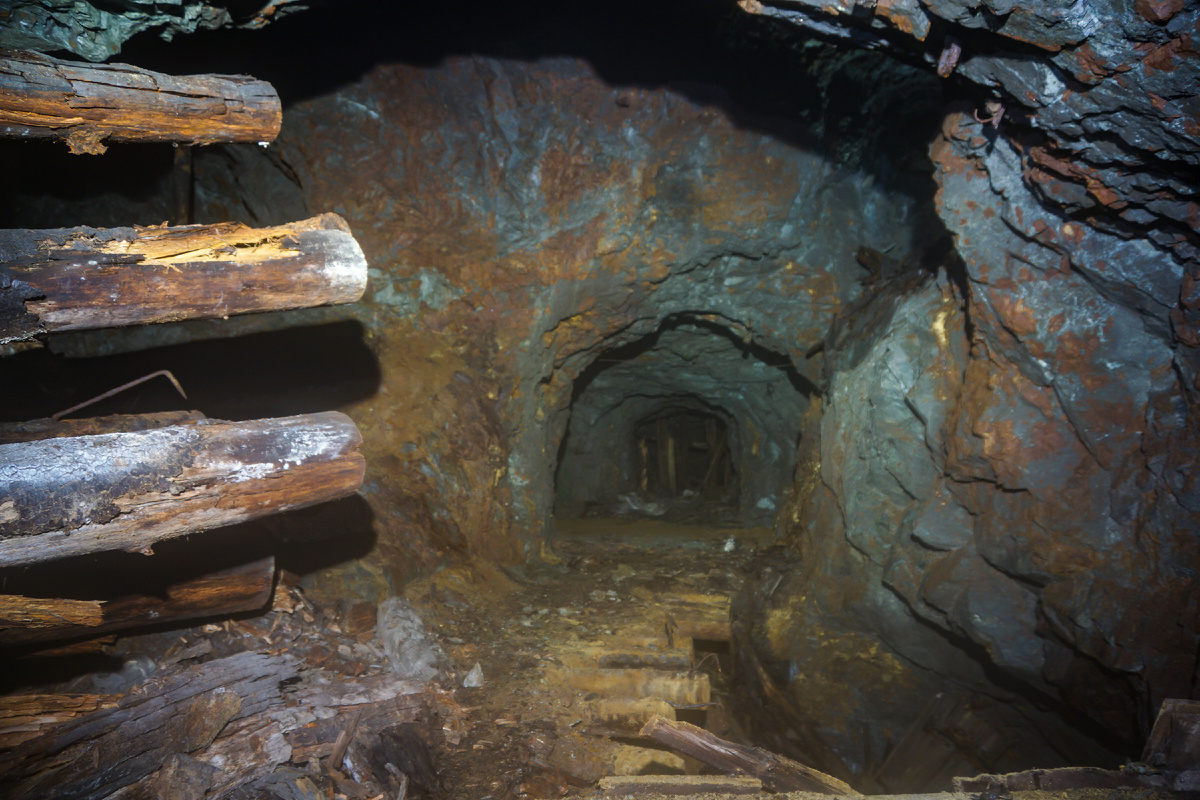Штольня продолжается, слева от нее очередная зона отработки пласта рудной залежи.