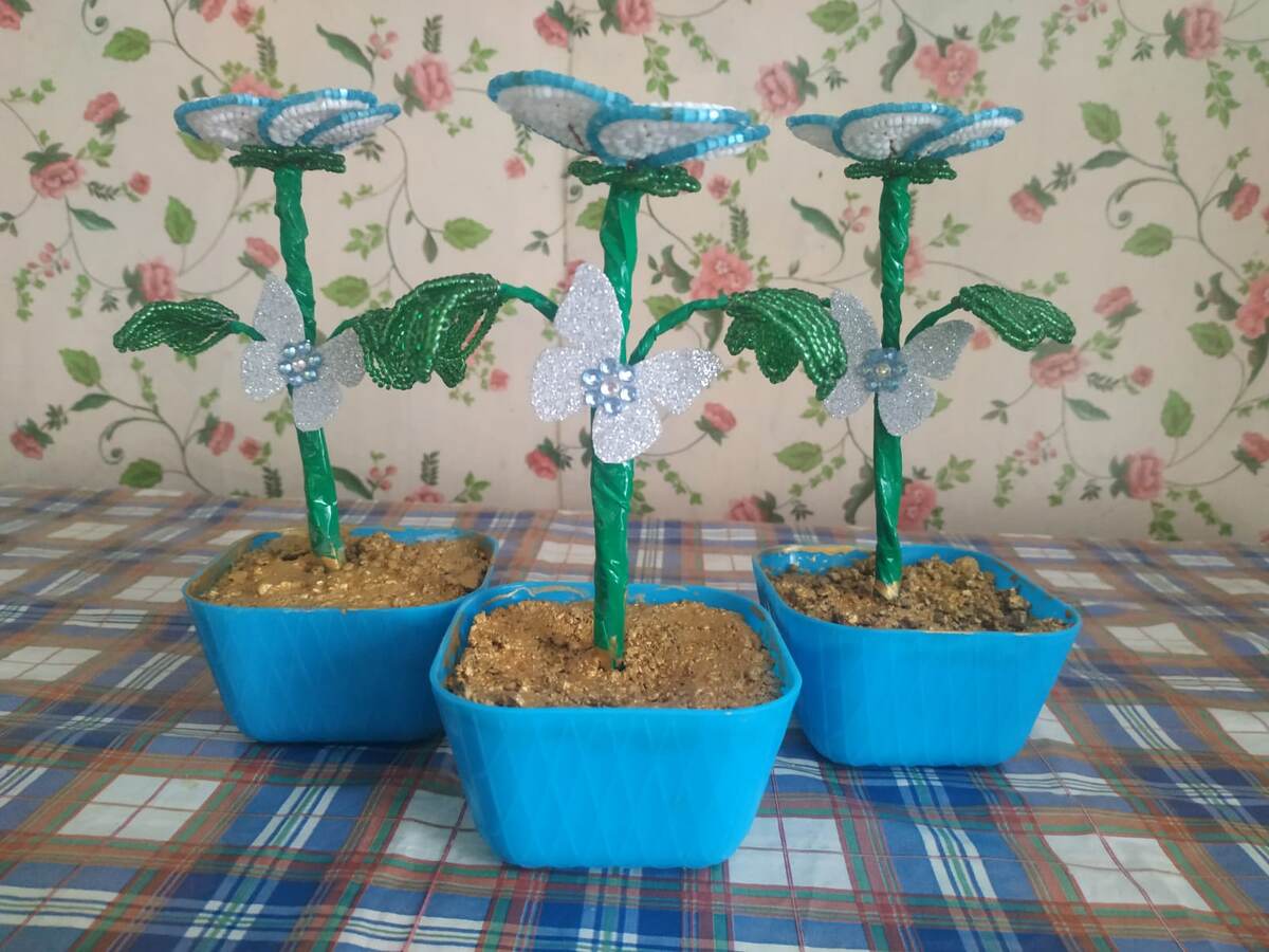 Бисер белый голубой, зелёный. Серединка розовая бусинка. Зелёный скотч, бабочка цветочек, цемент, золотой акрил, баночка для цветочка.