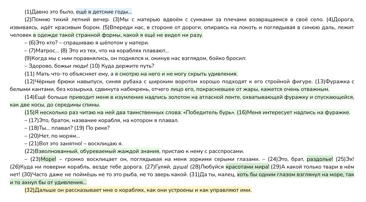 Ещё больше рассказчика увлекают рассказы матроса о бескрайнем море. Сравнение водной глади с безбрежным небом заставляет ребёнка вглядываться в «бездонную синь», представляя, как плывёт в ней корабль «Победитель бурь». Путешествие по морским просторам кажется ему чудесным, «как в сказке» (предложения 39-47), и он мечтает оказаться на корабле «в неведомых морях» (50). Можно сделать вывод: герой погрузился в захватывающую атмосферу плавания, и ему захотелось увидеть своими глазами те образы, которые рождались в его воображении.